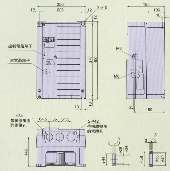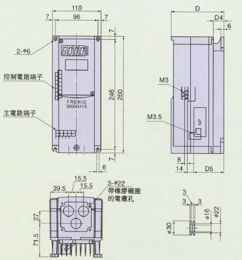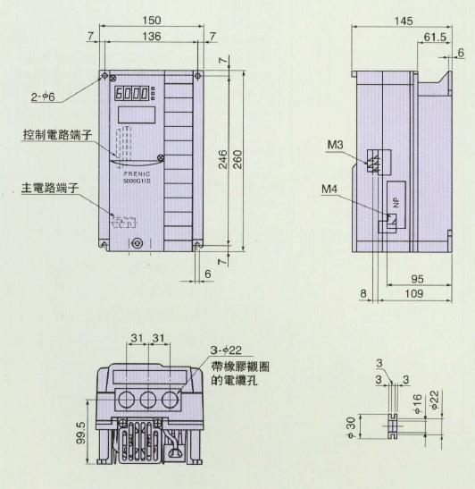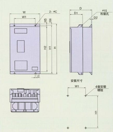 对£22kW变频器,允许横向密集安装,节省控制盘的安装空间。另外对£7.5kW,变频器的高度统一为260mm,使用多台不同容量的变频器时,安装盘设计容易。